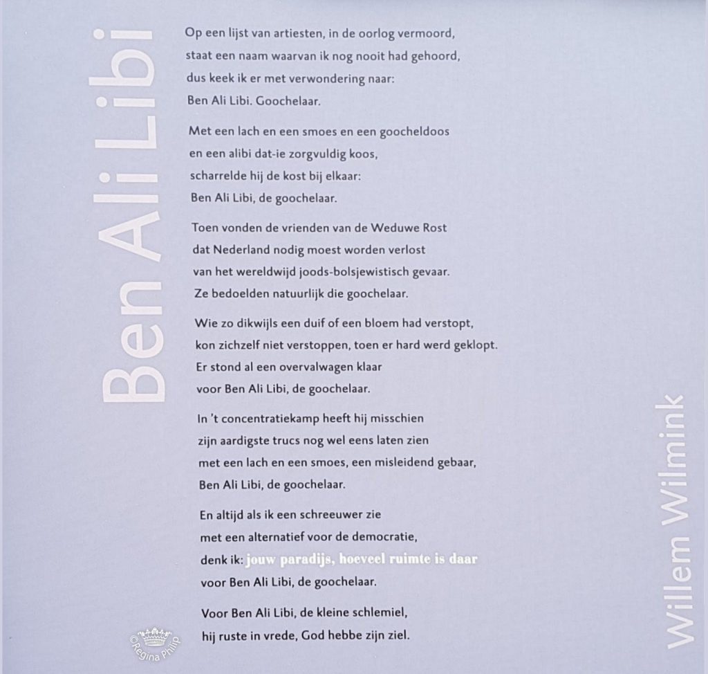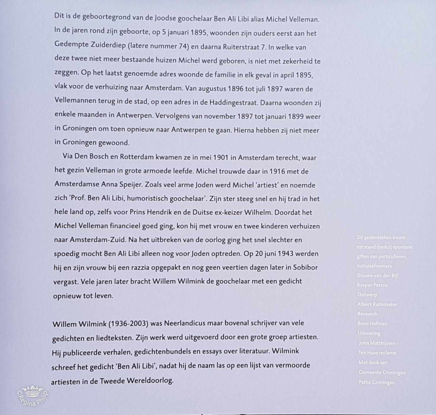 Aan de Ruiterstraat in Groningen werd op 2 september 2017 een veelbetekenend gedenkteken onthuld voor Michel Velleman, beter bekend onder zijn artiestennaam Ben Ali Libi. De goochelaar werd in 1895 in deze straat geboren, in een tijd waarin de Joodse gemeenschap rond het Zuiderdiep een hechte maar vaak armoedige buurt vormde. Hij bracht er slechts een deel van zijn vroege jeugd door, maar de stad is altijd zijn geboortegrond gebleven.