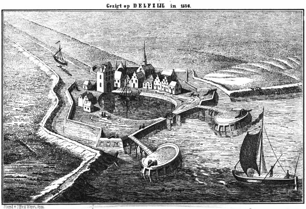 De Delf (ook wel Fivel genoemd) was vroeger een kleine, trage rivier die uitmondde in de Eems en door Romeinse vlootbezoeken bekend was. De monding heette in de volkstaal Eemderhaven. Toen die haven door slib onbruikbaar werd, groef men een nieuwe watergang (“delven”), waaruit de naam Delf ontstond. In 1272 werd er een schutsluis aangelegd, de Sandersluis, bij een boerderij aan de kust. Het volk noemde die sluis de Dorpsterzijl. Rond deze zijl ontstond een nederzetting die later uitgroeide tot de vestingplaats Delfzijl. De naam Delfzijl wordt voor het eerst genoemd in een oorkonde uit 19 juni 1303.